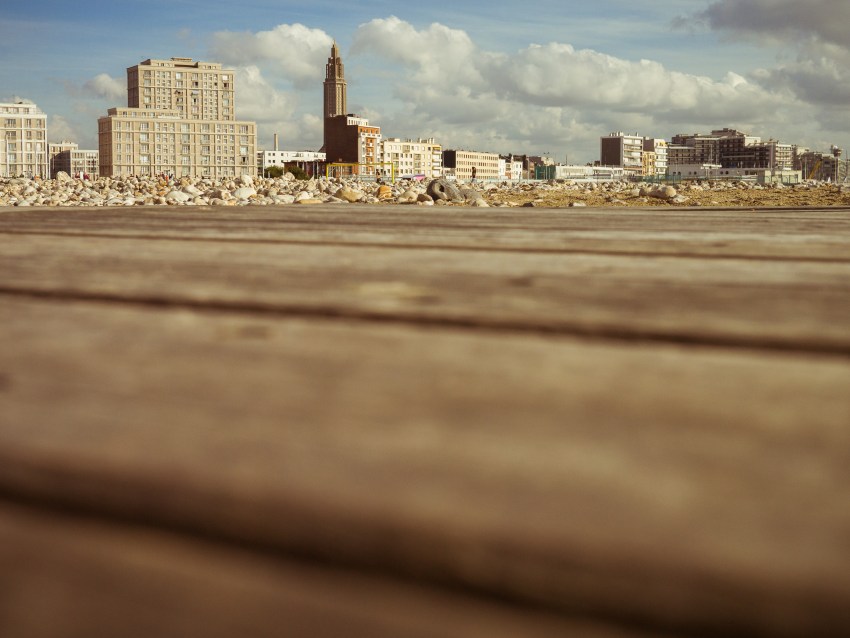D’ailleurs mon point de vue frôle le sol aussi: l’appareil photo posé sur les planches, cette approche permet de s’immiscer doucement sur la plage, les galets, vers la ville et de profiter d’un large champ dévoilant cette atmosphère de bord de mer, tout en appréciant les nuages qui veillent …. à ne pas trop découvrir le ciel quand même!