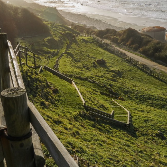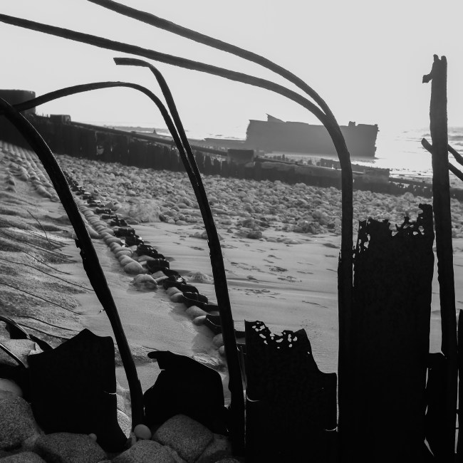 proche de là où je vis, sur une falaise, au bout d’un chemin, quelques 500 marches à descendre pour être dans ce lieu décor tout simplement magique, ou fantastique, ou époustouflant …. j’aime beaucoup cet endroit, il est de ceux où il y a toujours une atmosphère qui transporte, qui fait oublier ce qu’il y a avant les 500 marches… il fait oublier le temps aussi, la marée se charge de le rappeler, celle-ci dévoile une épave quand elle est basse, mais aussi des mollusques qui chantent … la lumière y est différente qu’ailleurs, les couleurs aussi …. le dessin de la falaise et ses strates se chargent de participer à cette ambiance lumineuse ou des fois même inquiétante en répondant au ciel plus ou moins nuageux … ici il y a des galets, mais aussi du sable ou de l’argile …. il y a ….. il y a surtout ce petit quelque chose qui donne toujours l’impression de venir pour la première fois …