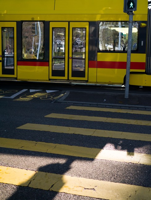 il est partout, serpente délicatement entre les belles façades de la ville, se faufile entre les piétons, laisse peu de place aux voitures, surgit du haut de ses couleurs jaunes et vertes éclatantes au coin d’une rue, dessine le ciel ou le sol avec ses lignes graphiques …