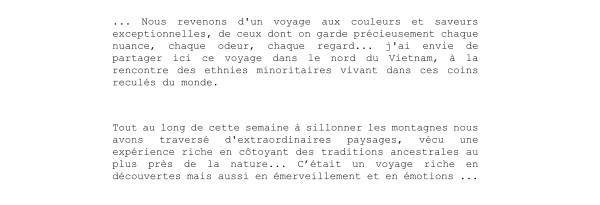 Au fil des jours, des marches dans le Vietnam, des rencontres, des villages traversés, c’était un festival de couleurs, de sourires et de générosité, touchant et infiniment enrichissant.